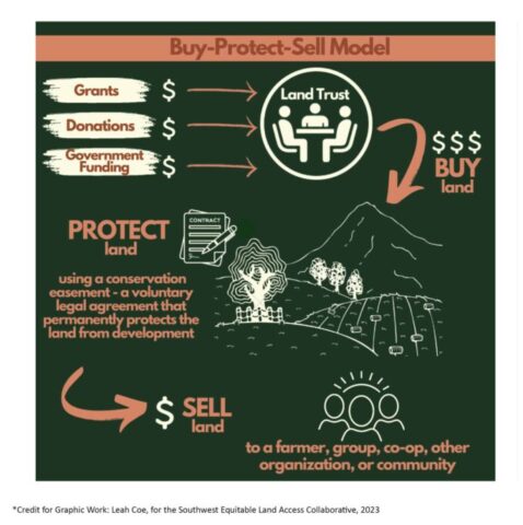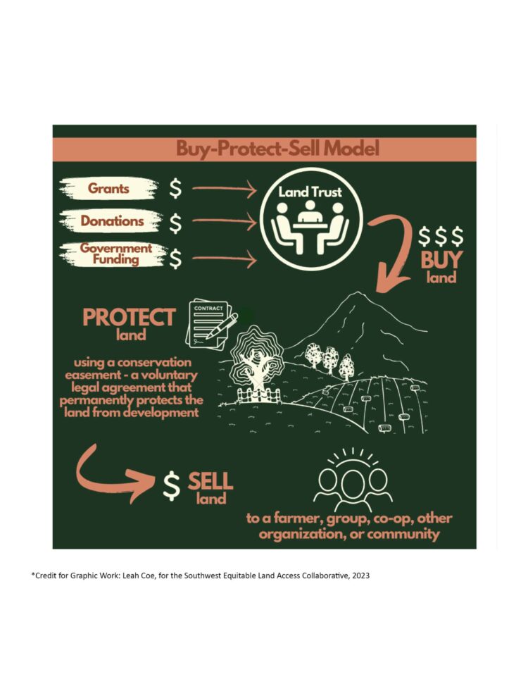 Buy-Protect-Sell ModelWhat is called the “buy-protect-sell” model is commonly found under the auspices of a land trust, which could have an urban, rural, or wider field of work. These initiatives usually involve long-term leases; they also can lead to purchases of land by individuals, groups, or communities. In this way, there can be steps towards the relative autonomy of a group or newly formed organization. Multiple goals can be pursued with these initiatives as well: including farming/gardening spaces for a variety of ethnic groups, CSAs, therapy and medicinal gardens, and areas devoted for children. Groundswell Conservancy, in Madison, Wisconsin, embodies this multi-dimensional approach, and they are contemplating the incubation of worker cooperatives.
