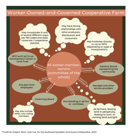 The diagram titled “Worker-Owned-and-Governed Cooperative Farm” outlines the organizational structure and relationships within a cooperative farm model.